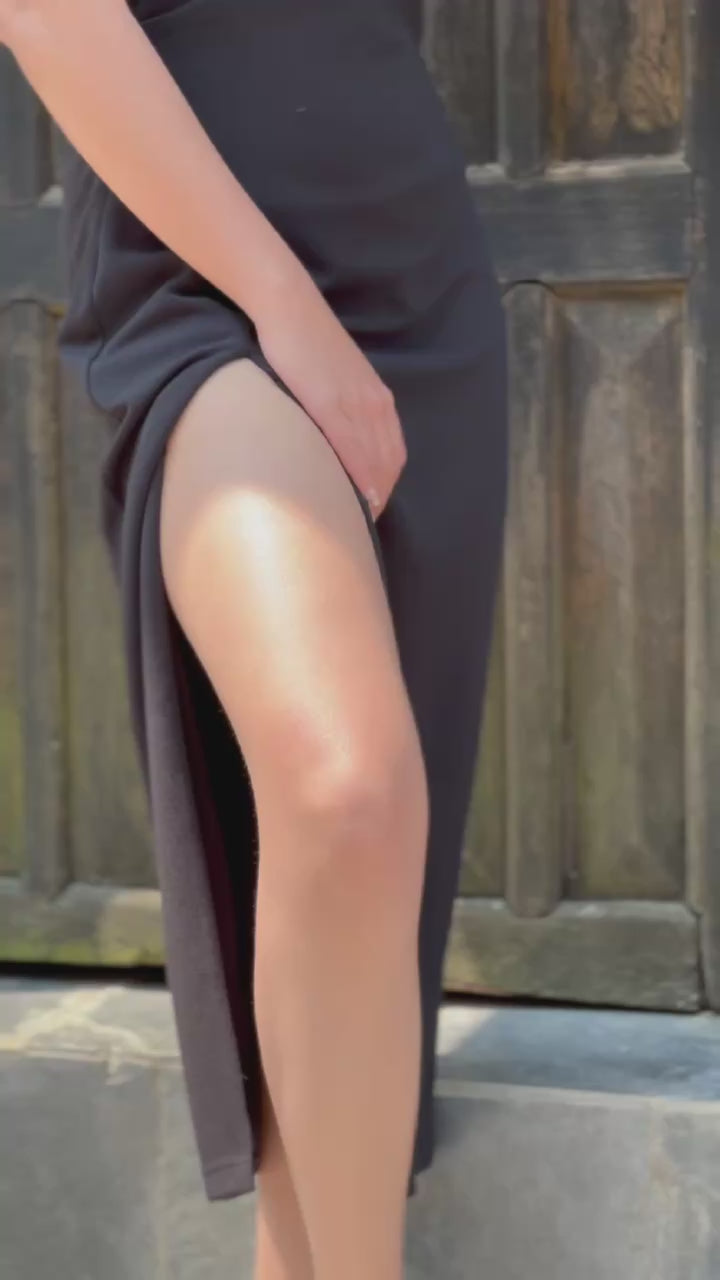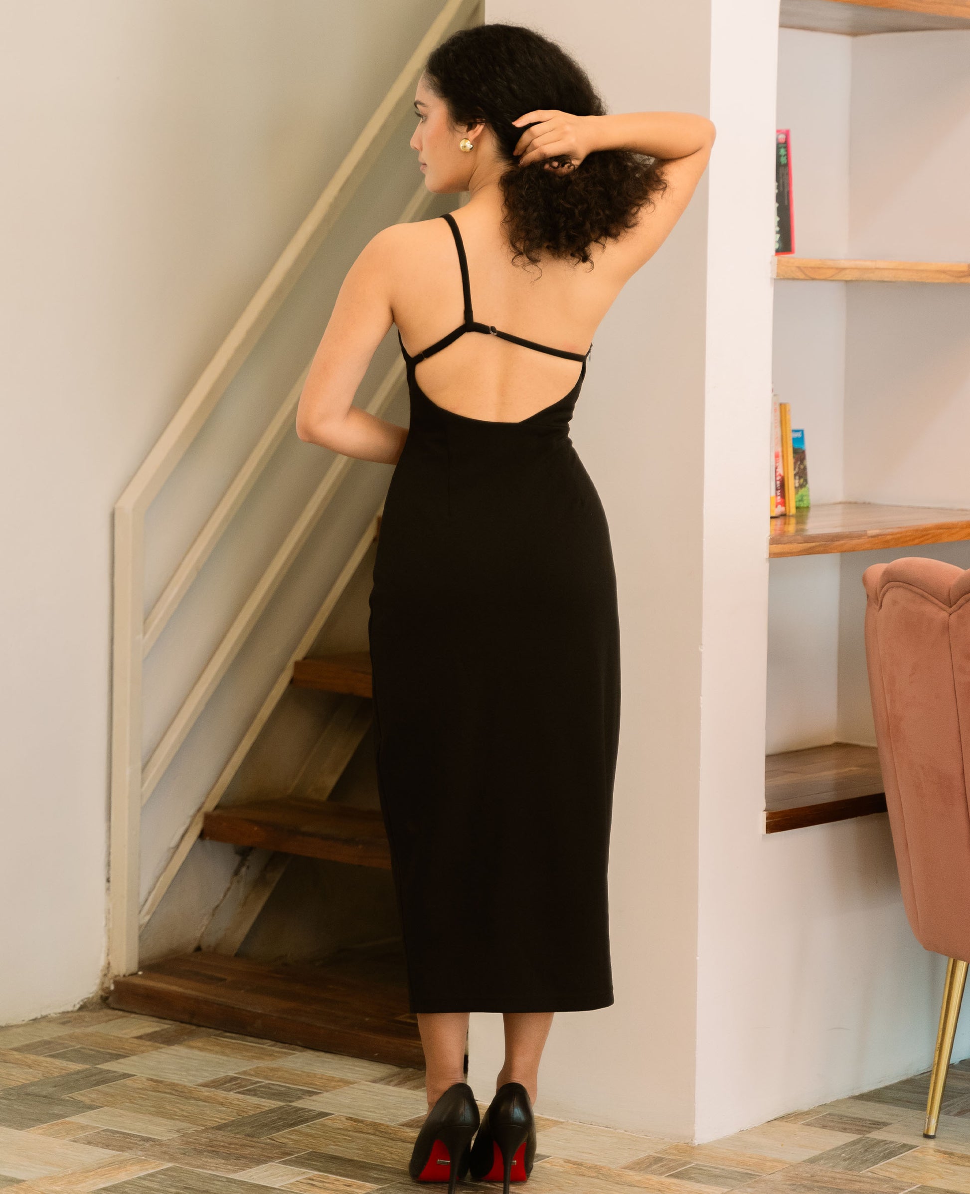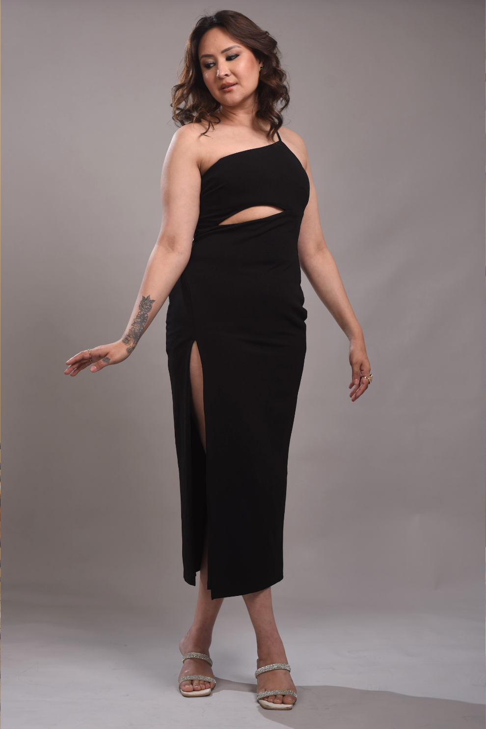 Cut out midi dress features a midi length, a neckline with one shoulder, thin adjustable strap crossed on the back, cutout on the front, open back, high split and invisible zipper. This garment is stretchy and has lining.