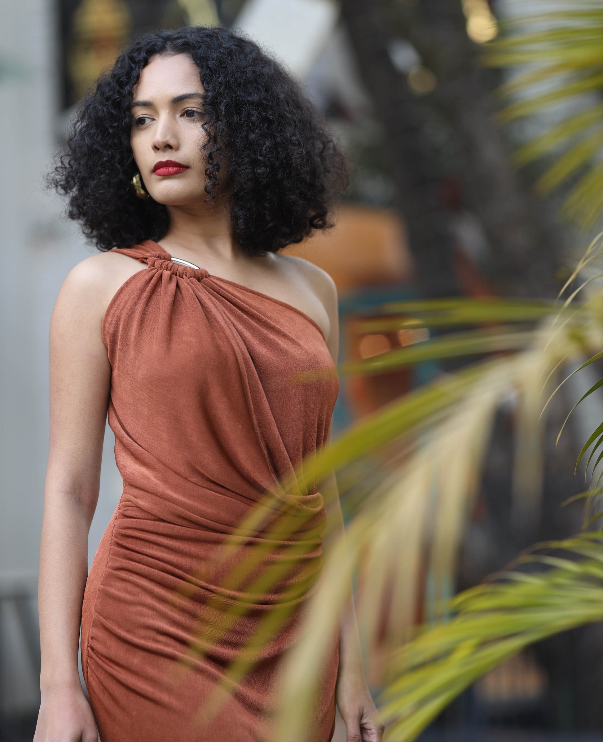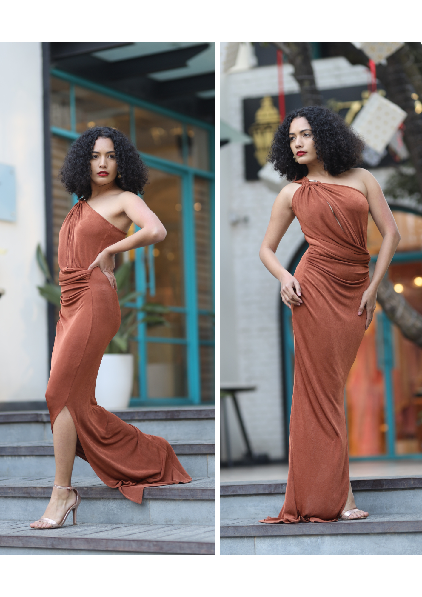 One shoulder draped maxi dress featured in both the royal blue and rust version. Subtle front keyhole detail and ruching along the waist, it is designed to contour your curves. Silhouette flows gracefully with every steps.