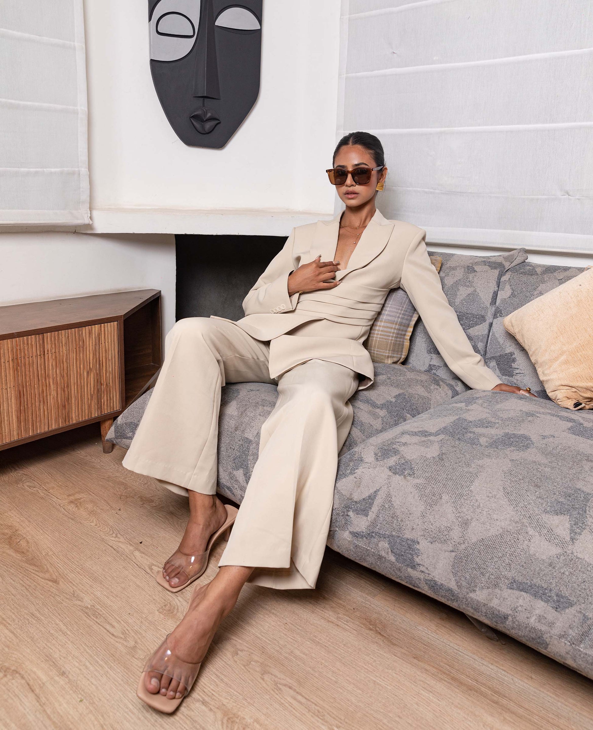 Make a fierce yet graceful statement in our Ivory Sculpted Blazer Set. Designed with pleated waist detailing and signature gold tassel buttons, this power piece blends sharp structure with feminine elegance. The tailored pants complete the look, making it perfect for modern boss moments or luxe evening events.