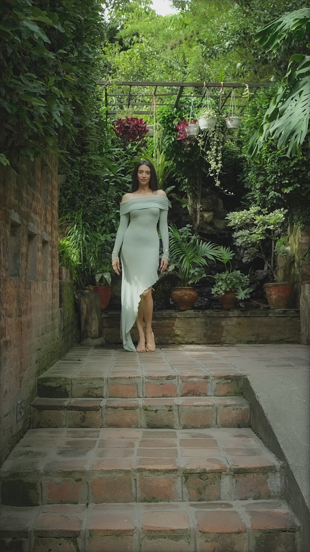 This Mint Bloom maxi has been expertly designed in a premium ribbed knit for a sculpting comfortable fit. It has an elegant bardot neckline with long feminine sleeves and a romantic skirt for added flare. Dress this style from day to night by styling with our hear me court heels and some gold accents.