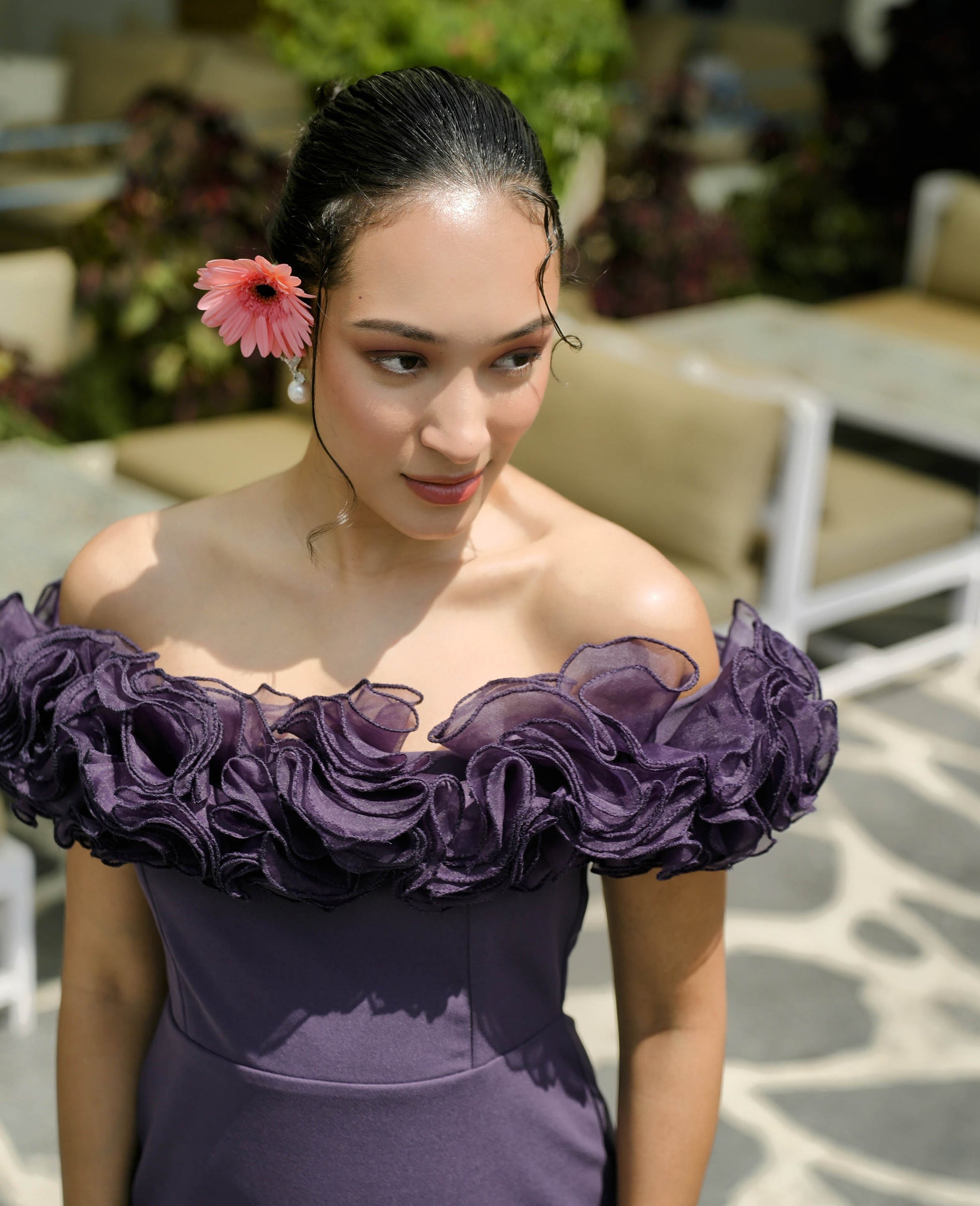 Accentuate your tender shoulders with the meringue ruffle midi silhouette dress. The fabric is thick enough to shape your body creating seductive curves. Zipper on the back, lined.