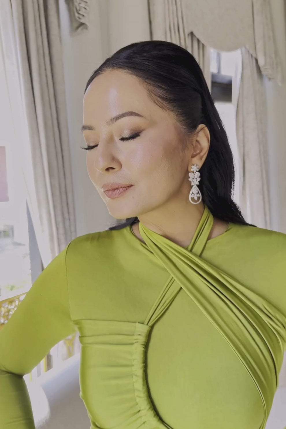 Premium stretch jersey with a soft feel, body hugging, stretchy, asymmetric pleated neckline, ruched bust detailing. Matching skirt set. Available colors: chocolate brown, lime green and royal blue